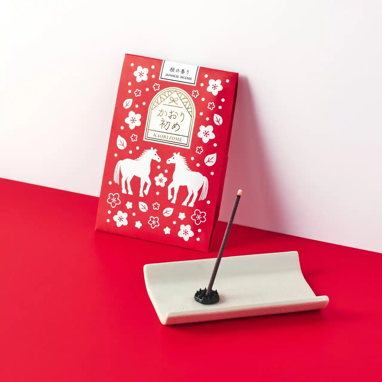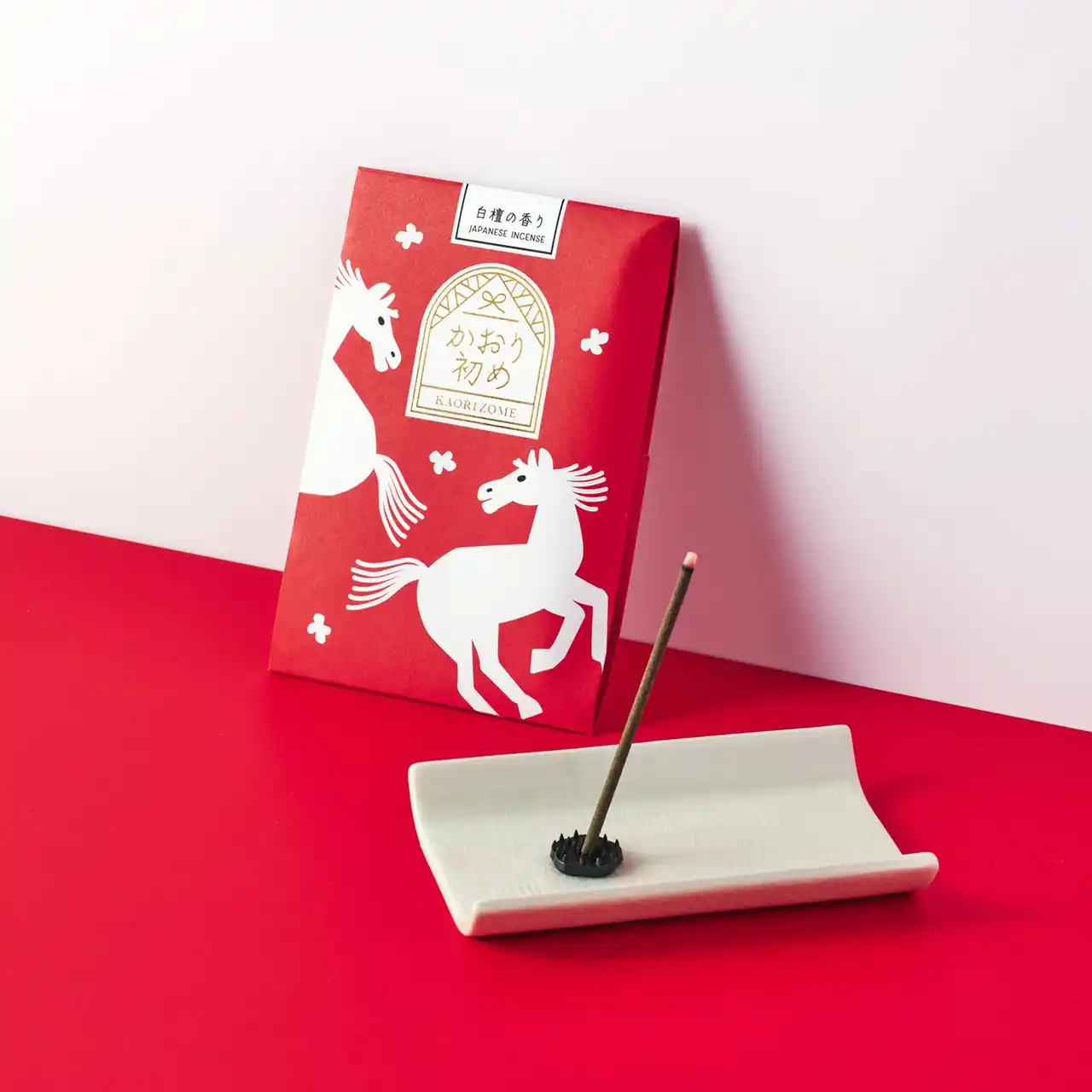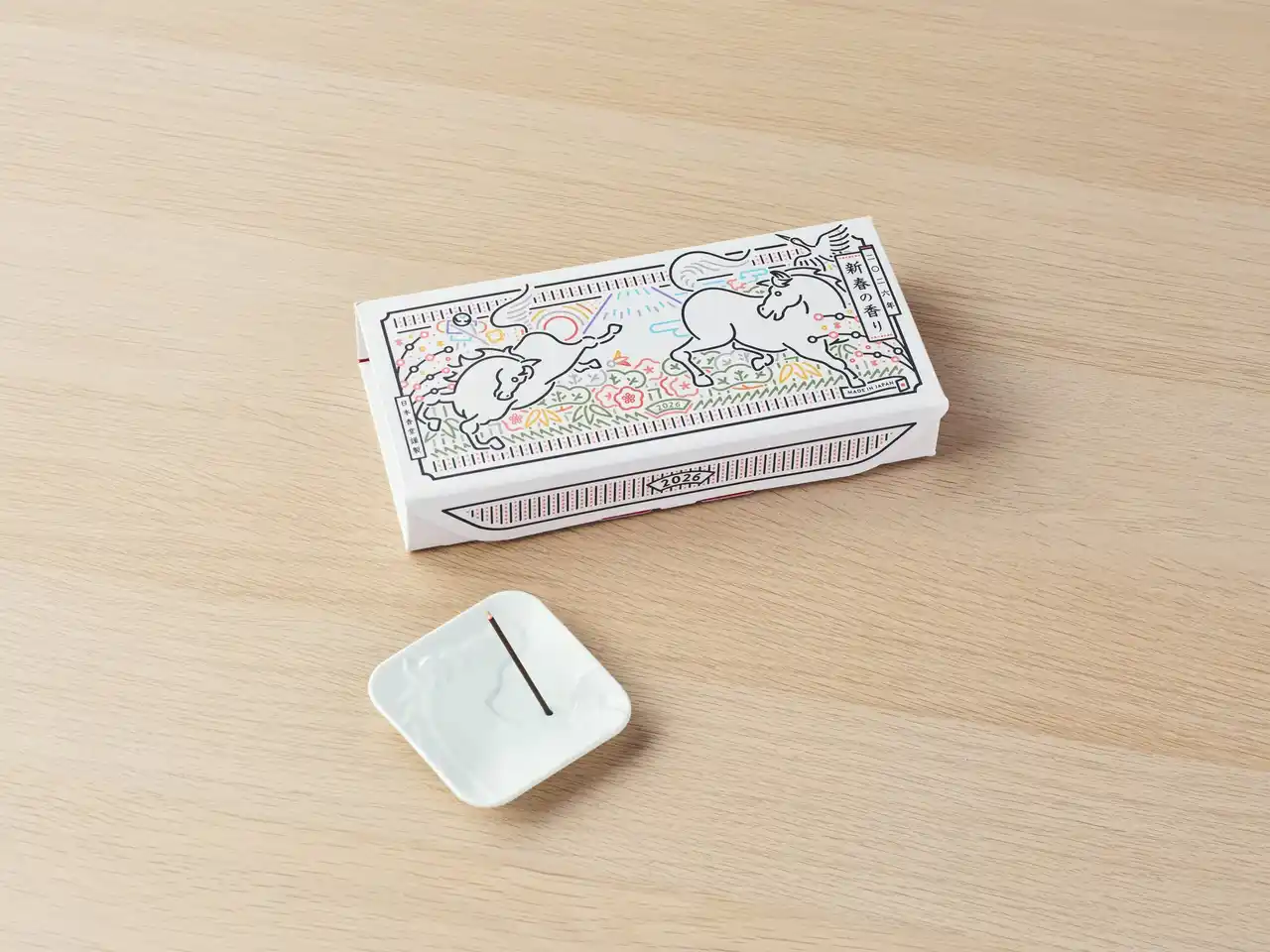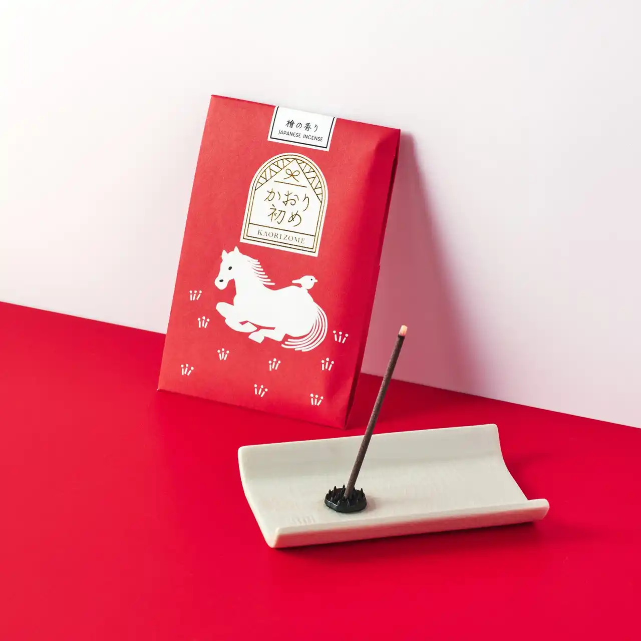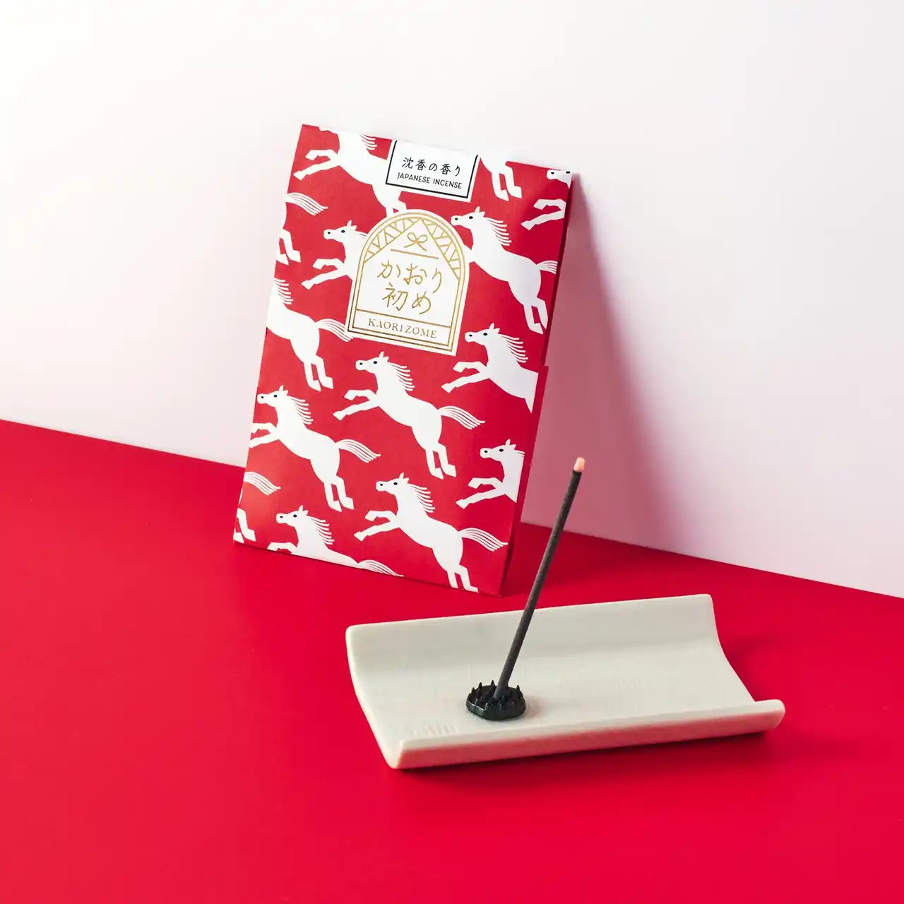 2026年の干支「午」をモチーフにした特別な香皿と、新年にふさわしい香り「沈香」のお香6本のセットです。 |