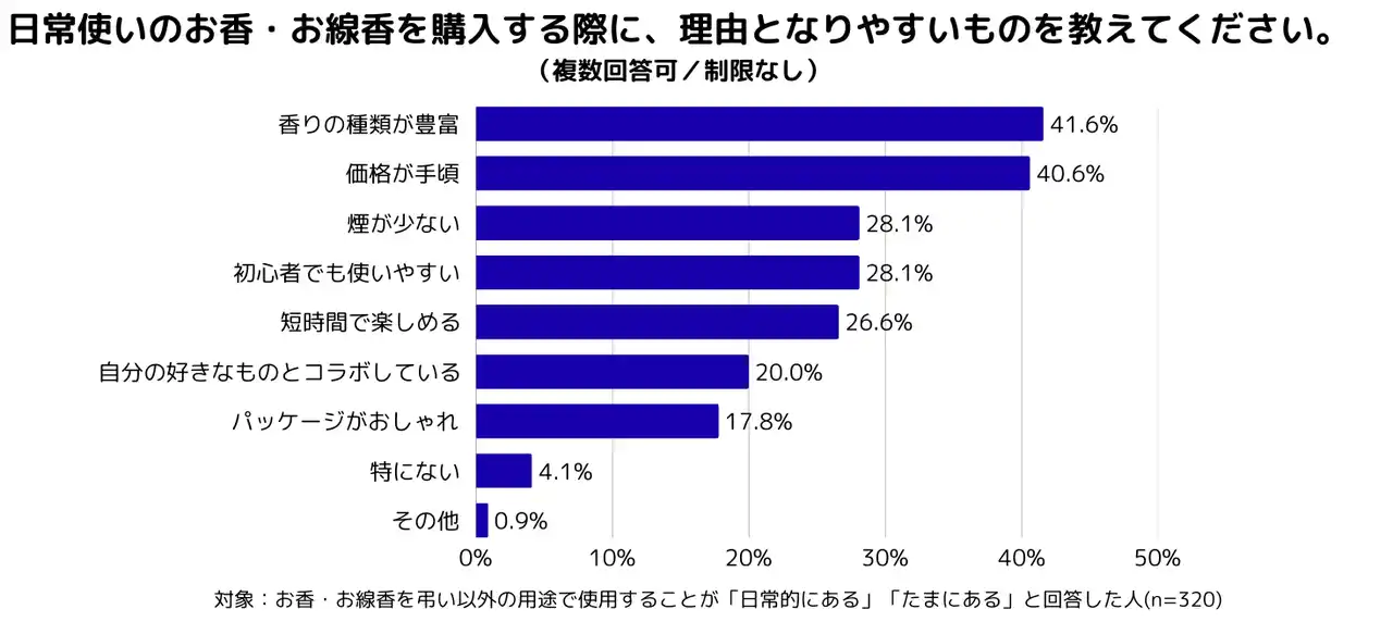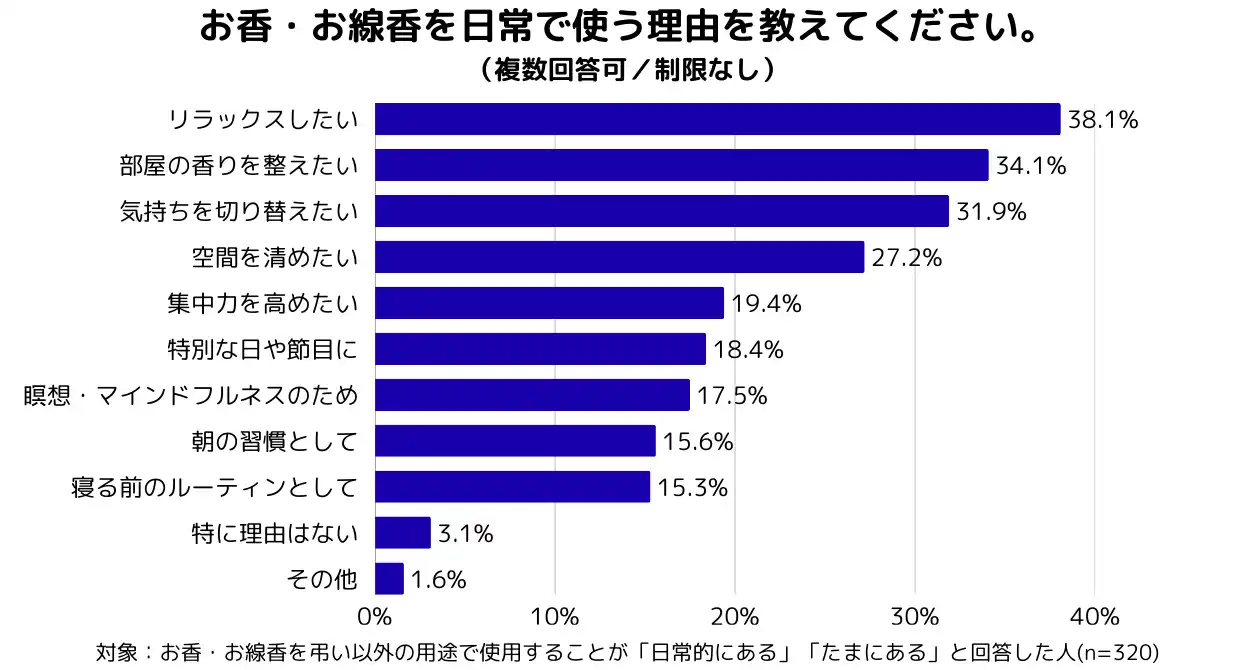 使用理由としては、「リラックスしたい」(38.1%)が最も多く、次いで「部屋の香りを整えたい」(34.1%)、「気持ちを切り替えたい」(31.9%)となり、お香・お線香が日常生活における心のケアツールとして活用されていることがわかりました。 |