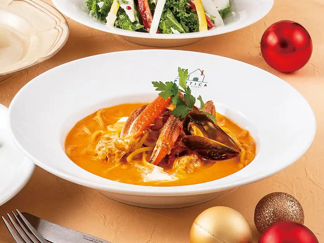 渡り蟹、ムール貝の旨味を濃厚ビスクスープで閉じ込めた絶品スープパスタ『魚介のビスクスープパスタ』をご提供。 |