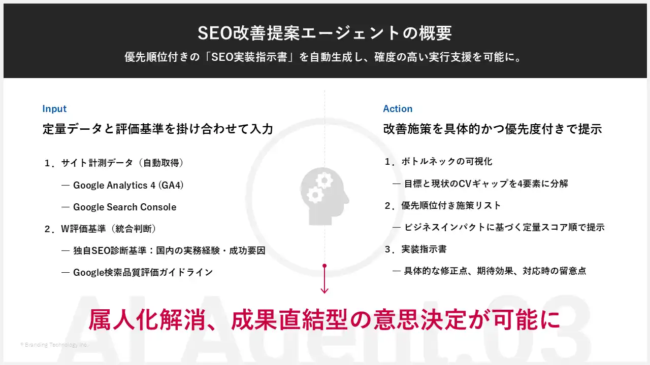 ブランディングテクノロジー株式会社(代表取締役社長:木村 裕紀、本社:東京都渋谷区、証券コード7067、以下当社)は、株式会社ジーニー(代表取締役社長:工藤 智昭、本社:東京都新宿区、証券コード6562)のグループ会社であるJAPAN AI株式会社(代表取締役社長:工藤 智昭、本社:東京都新宿区、以下、JAPAN AI)との資本業務提携に基づく共同開発プロジェクトの第三弾として、「SEO改善提案エージェント」を開発したことをお知らせします。 |