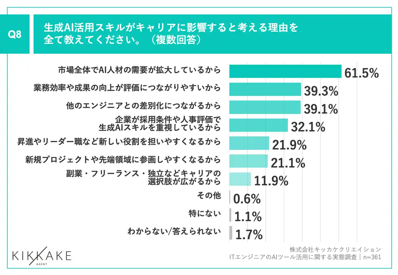 Q6で「非常に大きく影響する」「やや影響する」と回答した方に、「Q8.生成AI活用スキルがキャリアに影響すると考える理由を全て教えてください。(複数回答)」(n=361)と質問したところ、「市場全体でAI人材の需要が拡大しているから」が61.5%、「業務効率や成果の向上が評価につながりやすいから」が39.3%、「他のエンジニアとの差別化につながるから」が39.1%という回答となりました。 |