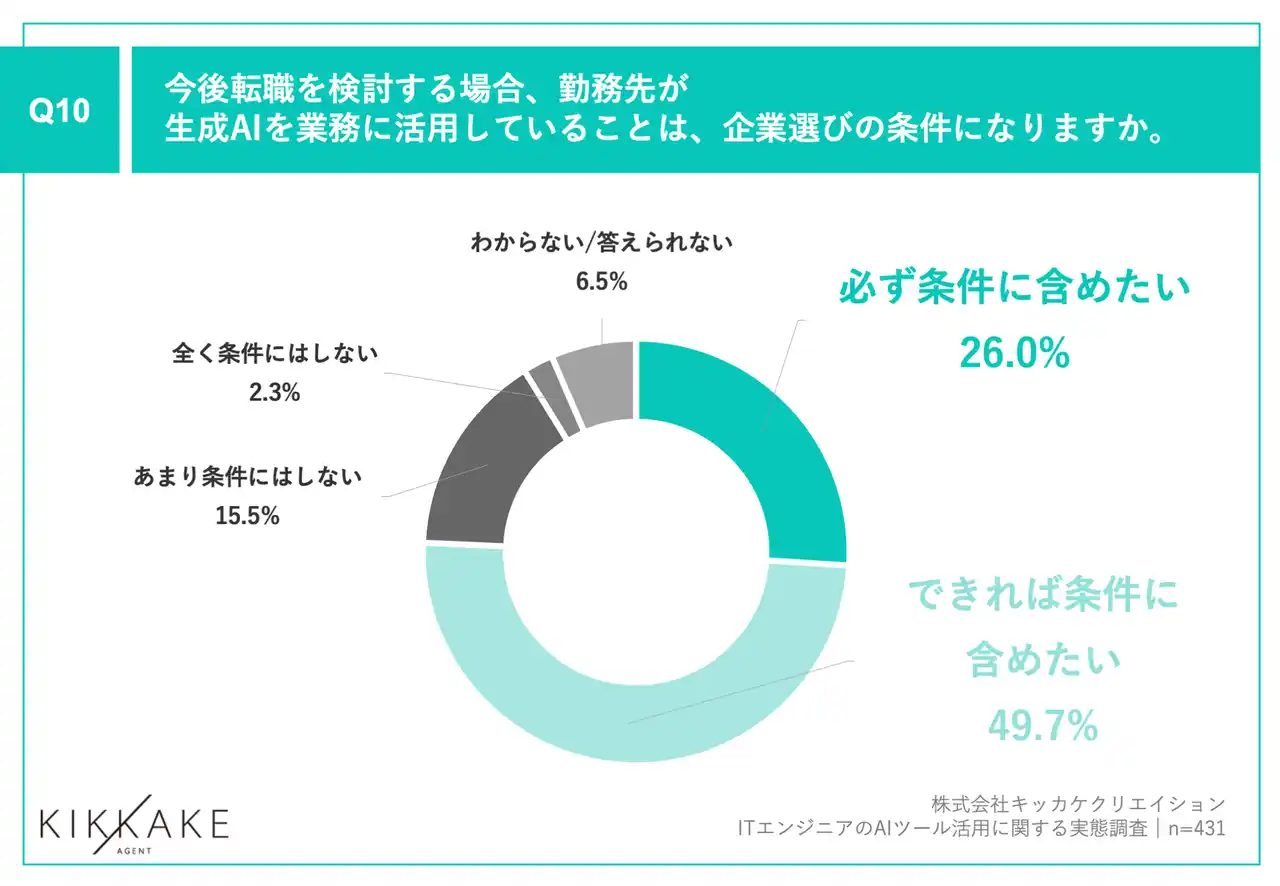 「Q10.今後転職を検討する場合、勤務先が生成AIを業務に活用していることは、企業選びの条件になりますか。」(n=431)と質問したところ、「必ず条件に含めたい」が26.0%、「できれば条件に含めたい」が49.7%という回答となりました。 |