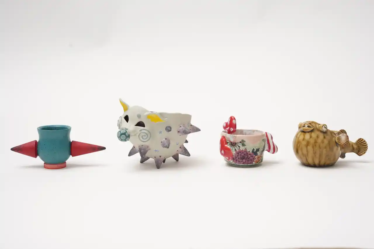 左から 酒井智也「ReCollection Cup」、AOI「チクッと杯×ectoplasm」、水元かよこ「一角獣」、森聖華「しっぽり飴釉河豚ぐい呑」 |