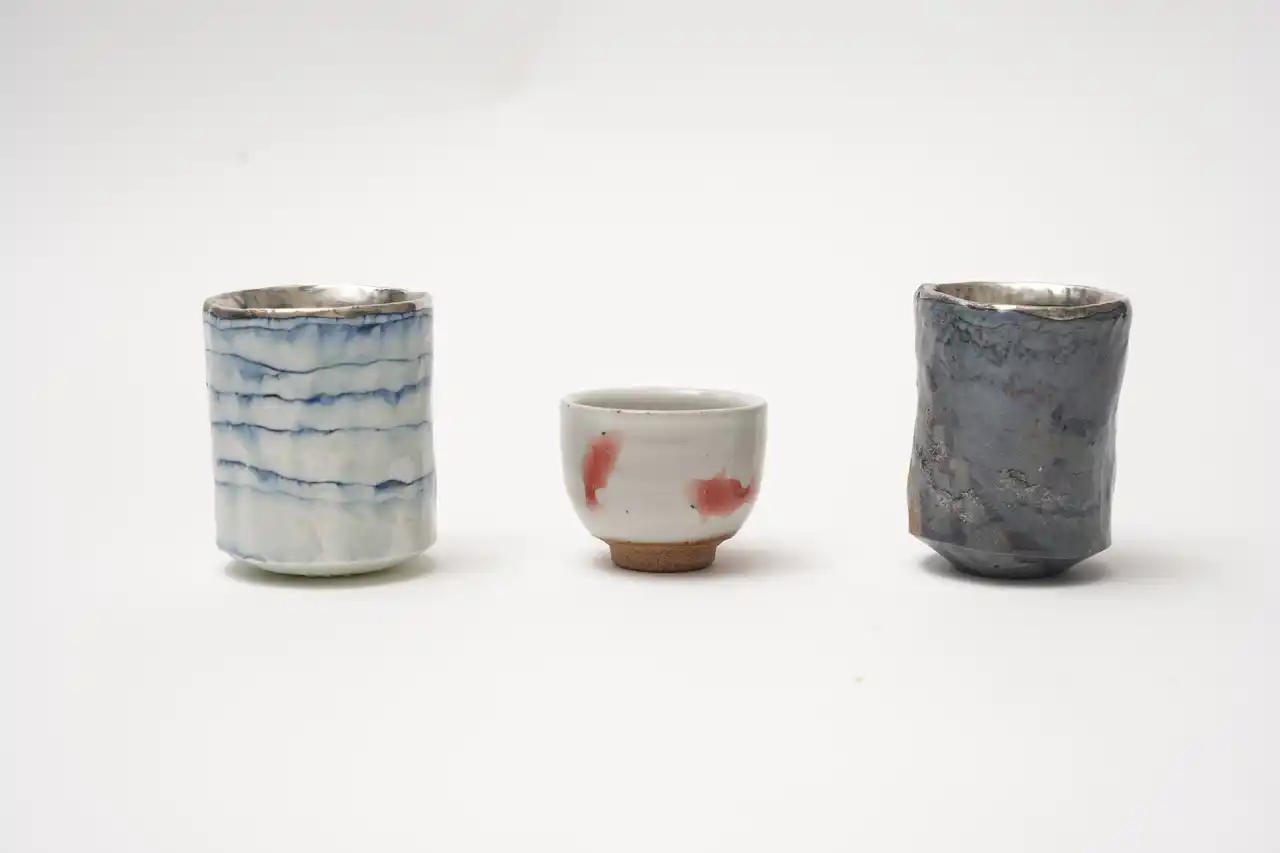 左から 中井波花「till ぐい吞み 染付」、安田直子「金魚文ぐい呑」、中井波花「till ぐい吞み 炭化CCoCu」 |