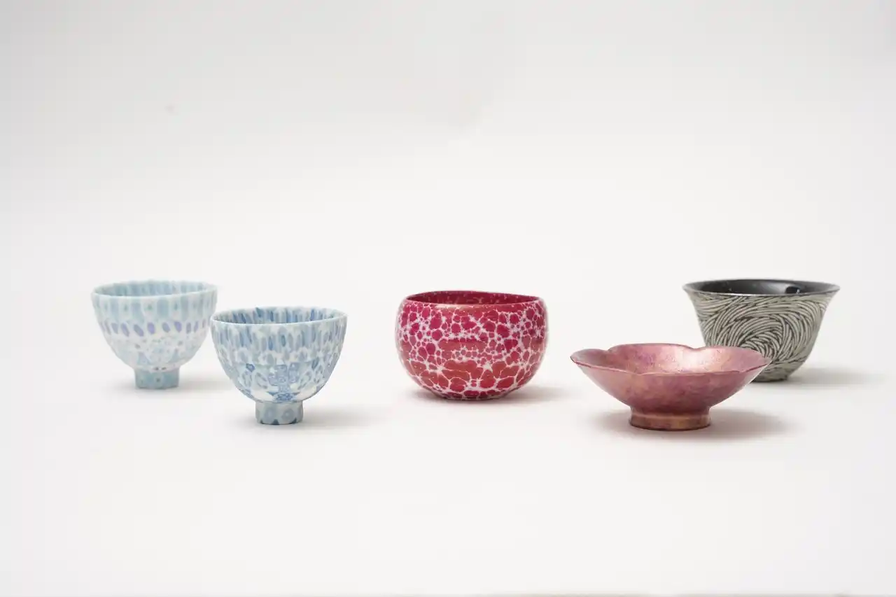左から 金田萌永「透光練込ぐい呑」、金田萌永「透光練込ぐい呑」、増原嘉央理「らぴす 牡丹ぐい呑」、増原嘉央理「綺光彩輪花酒盃 花筏」、増原嘉央理「girar ぐい呑」 |