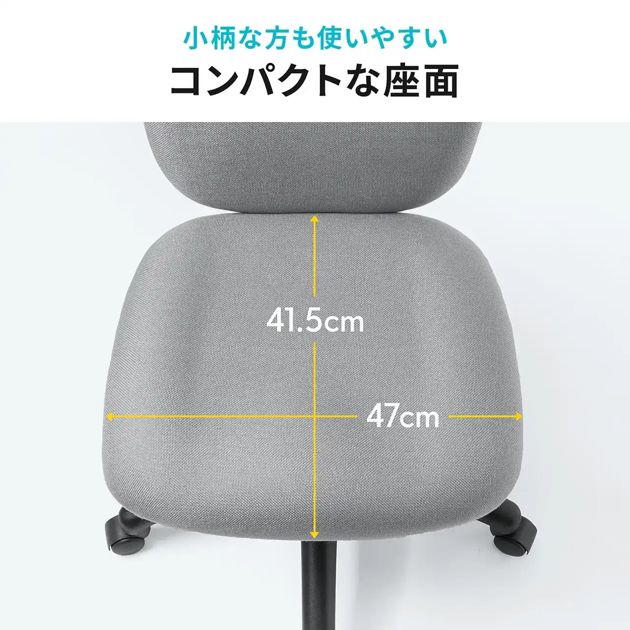 | 座面奥行は41.5cmのコンパクトサイズ。限られたデスク周りやワンルームの作業スペースでも圧迫感が少なく、動きやすさも確保できます。幅約47cmで安定感もあるため、体格を問わず使いやすい絶妙バランス。デスク下への収まりも良く、部屋をすっきり見せたい方にもおすすめです。 | |||||||||||