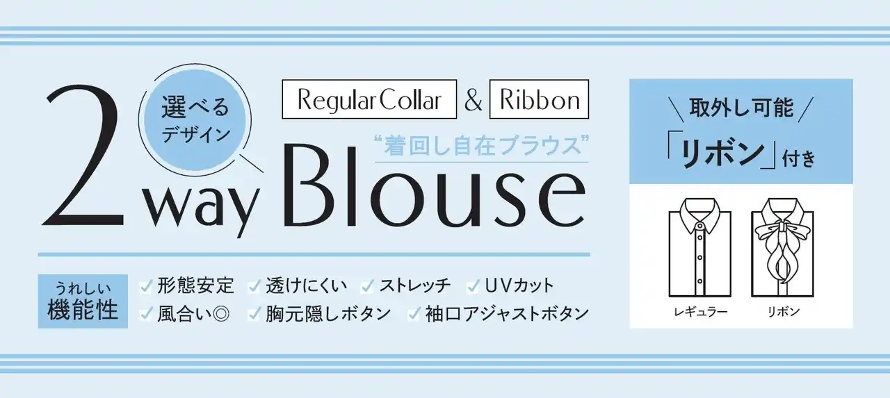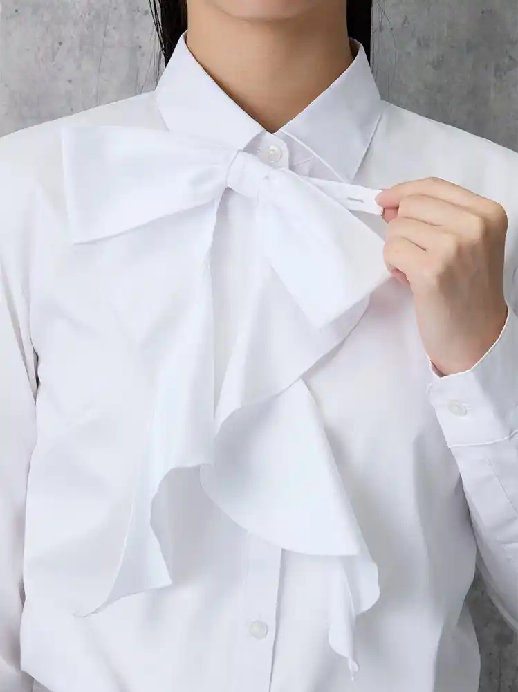 本ブラウスの最大の特長は、取り外し可能なリボンにより、着用シーンに合わせて2通りの着こなしが楽しめる点です。リボンを付ければ華やかな印象に、外せば就活などのフォーマルシーンにも対応可能な白無地デザインとなります。リボンは予め結び目が固定されているため、取り付けが簡単で身だしなみを整える手間を省けます。 |