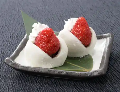 旬のいちごを丸ごと包み込んだ、みずみずしく甘酸っぱい魅力あふれるいちご大福です。ふんわりやわらかなお餅とほどよい甘さのあんこが、フレッシュないちごの果実と絶妙に調和し、やさしく上品な和のデザートに仕上げました。 |