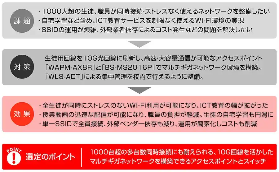 学校法人希望学園 札幌第一高等学校は1958年創立の歴史ある高校であり、生徒数が1000名を超える札幌市屈指の大規模校です。特にICT教育や英語教育に力を注いでいる進学校であり、今回、全生徒が校内のWi-Fi(無線LAN)をストレスなく使用するため、Wi-Fi環境を刷新。生徒用回線を10Gbps回線に刷新し、文部科学省のガイドラインを上回る帯域を確保。高速・大容量通信規格Wi-Fi 6(11ax)対応のアクセスポイントを各教室および各棟に設置し、全生徒が同時にオンライン英会話や共同編集、動画視聴を行っても遅延や切断がほぼ発生しないマルチギガネットワーク環境を実現しました。 |