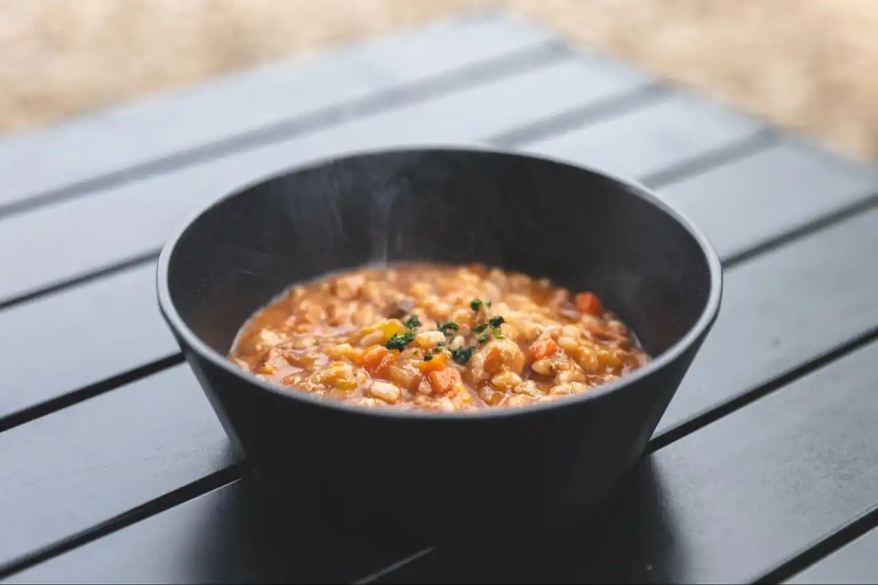 初期メニューは主食として楽しめる「キーマカレー」と「もち麦のトマトリゾット」。「サウナの後に外で食べる」シリーズは、11月30日に開業した『Earthboat Nasu』をはじめとするEarthboatの各拠点の物販※でレトルトパッケージで提供され、Earthboatの客室に備え付けのキッチンで簡単に調理しお召し上がりいただけます。 |