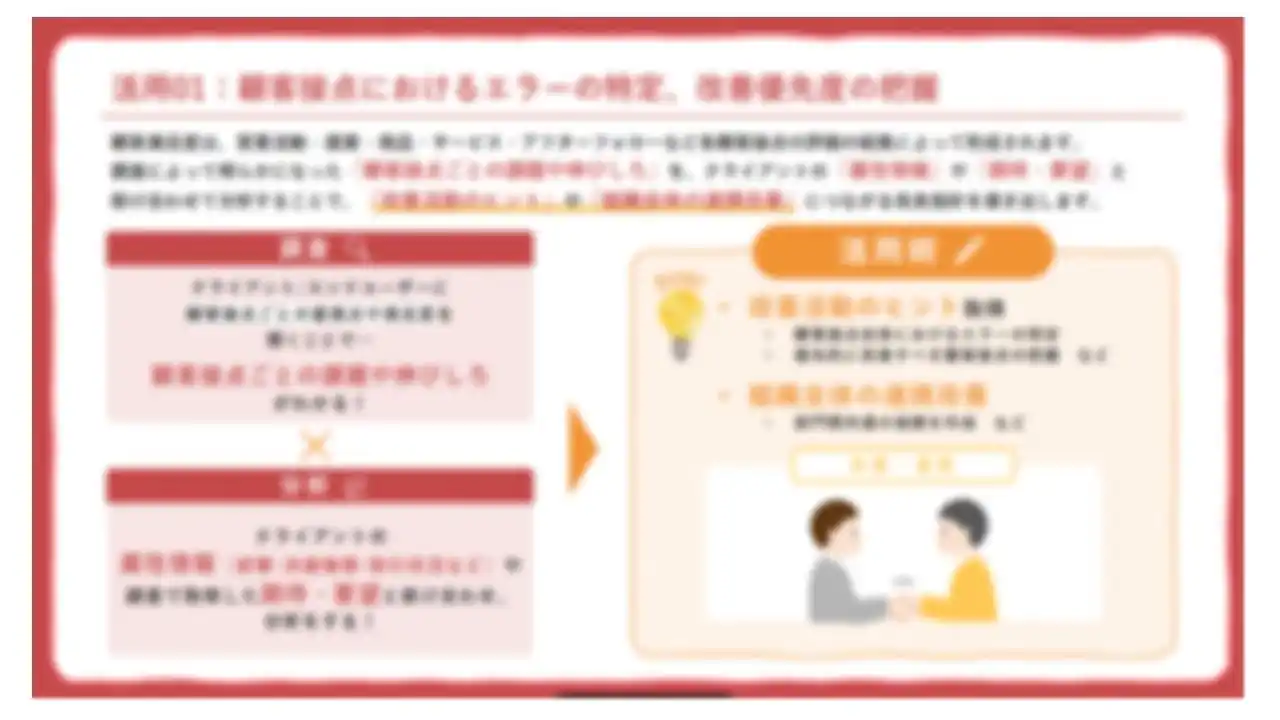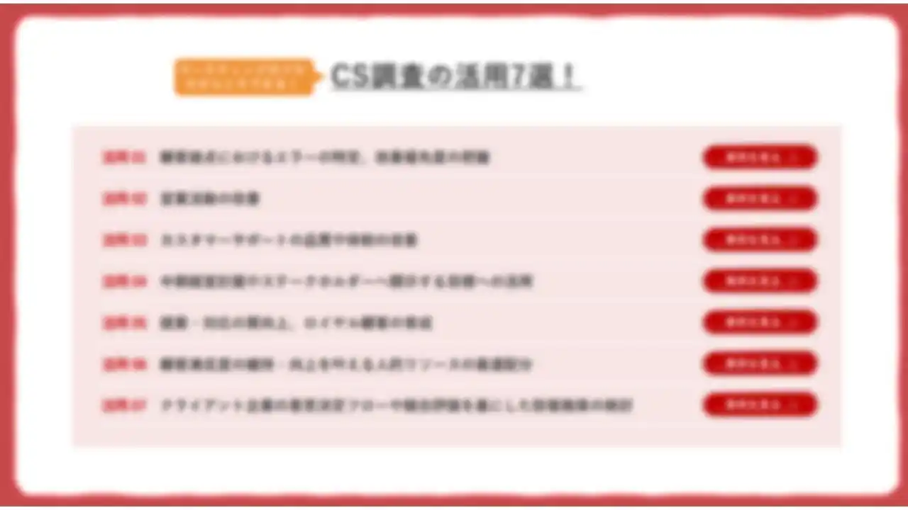 本活用術・事例集では、CS調査の結果を単なる満足度の測定にとどめず、営業・サポートの改善から経営戦略への反映に至るまで、幅広く活用するための視点を紹介しています。 |