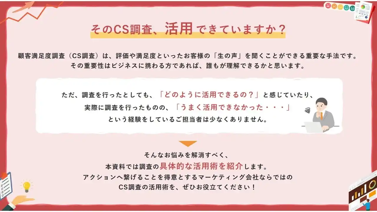 顧客満足度調査は、多くの企業で導入されている一方、「調査は行ったが活用できなかった」「改善施策に結びつけられなかった」といった課題も少なくありません。 |