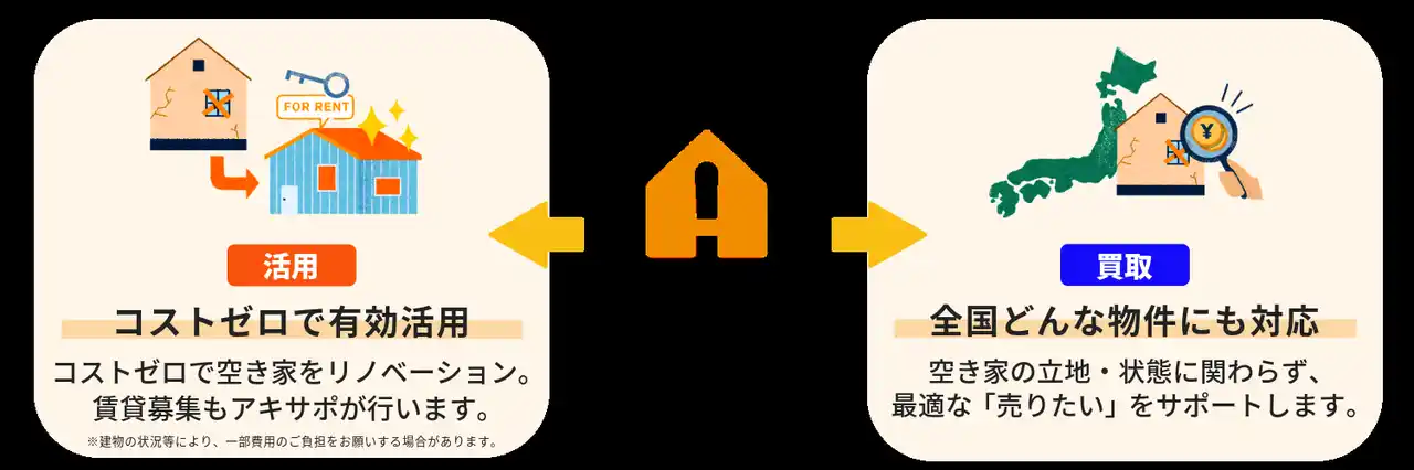 「アキサポの買取」では、「アキサポ」が直接空き家を買い受ける買取サービスを展開しております。 |