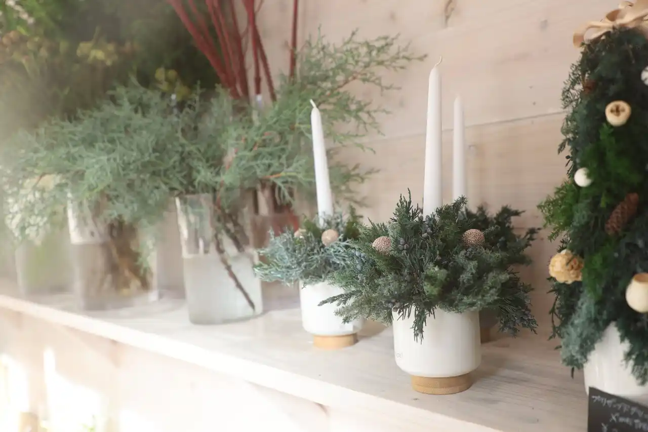 園内のフラワースタジオBloomRoomでは、フローリストが作るクリスマスのアレンジメントを販売しています。フレッシュグリーンやプリザーブドグリーンを使ったオリジナルのクリスマスアレンジメントです。 |