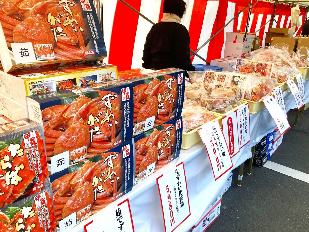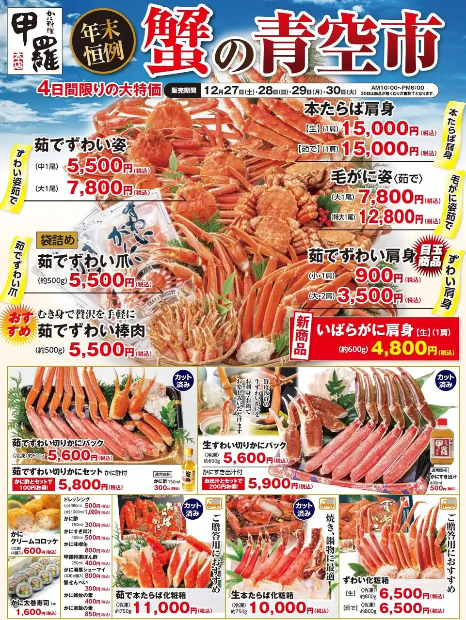 かに料理専門店「甲羅本店」が年末にお届けする人気ベント「蟹の青空市」。今年も店舗で特設売場を設置し、4日間限定(関東エリアは3日間)で開催いたします。創業から50年以上の歴史をもつ「甲羅本店」が独自ルートで仕入れた、厳選の本たらば蟹やずわい蟹、毛がになど肉厚で濃厚な味わいの蟹を日頃のご愛顧に感謝して特別価格にて提供します。 年末年始のご家庭用に上質な甲羅本店の蟹を求めて、毎年多くのお客様が行列をつくる様子は年末の風物詩となっています。 |