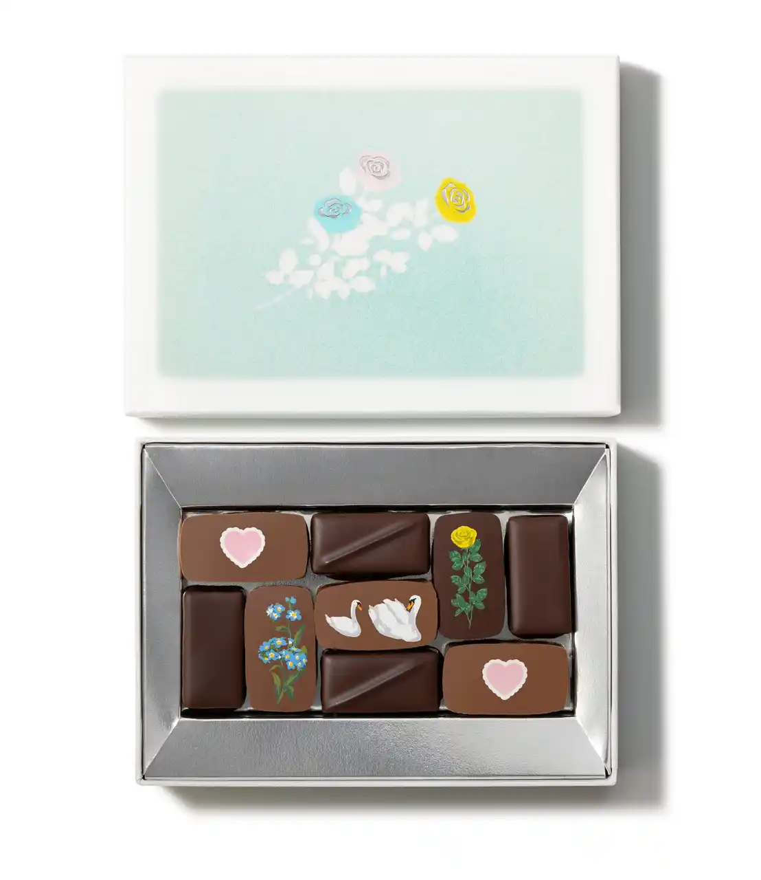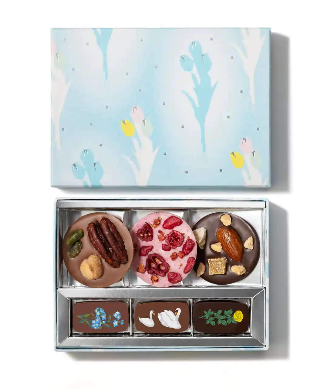 白鳥やお花をプリントした華やかなローズの香りや、ナッツの味わいのチョコレート。ナッツやベリー、レモンをトッピングした、彩り豊かなマンディアン。2種類のチョコレートを詰め合わせました。 |