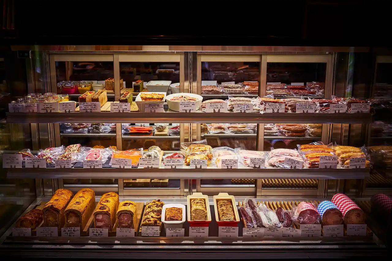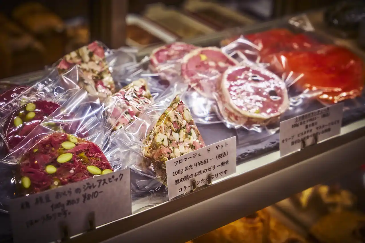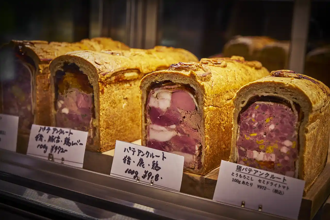 | 店頭には常にケースを埋め尽くすほど多彩なシャルキュトリが並び、新作は訪れるお客様の垂涎の的に。自ら猟に出て、仕留めたジビエを一から加工することも日常茶飯事で、その加工技は“美しい”という言葉がふさわしい領域に達しています。 | |||||||||