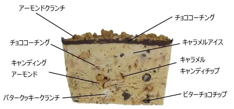 蓋を開けると、キャラメルアイスをチョコレートでたっぷりと覆い、その天面にアーモンドクランチをびっしりと敷き詰めています。「N.Y.リッチスカッチサンド&Wチョコレート」ならではのビター感とアーモンドの風味、食感をダイレクトに表現しました。キャラメルアイスと一緒に口に運ぶと、ふわりとチョコの香りが広がり、追いかけるようにキャラメルのコクが広がります。香りも甘みも贅沢に重なる奥行きのある仕上げです。 |