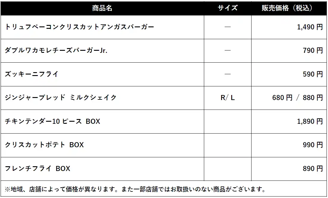 また、デザートメニューでは「ジンジャーブレッド ミルクシェイク」を期間限定で販売します。甘くてスパイシーな味わいはハンバーガーと相性が良く、美味しくお召し上がりいただけます。 |