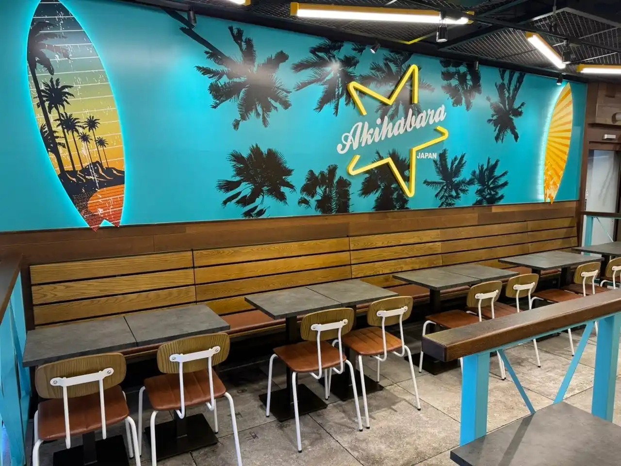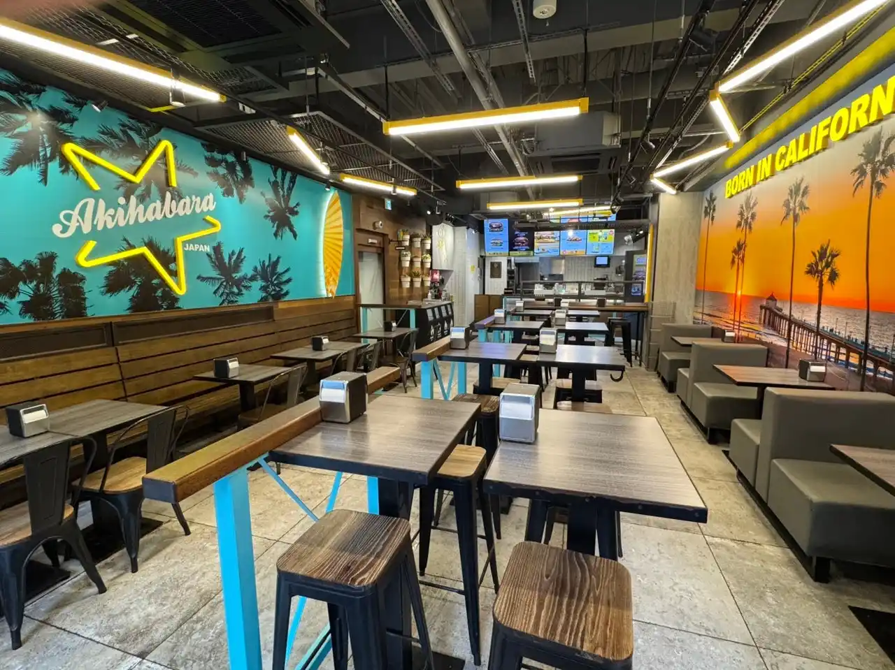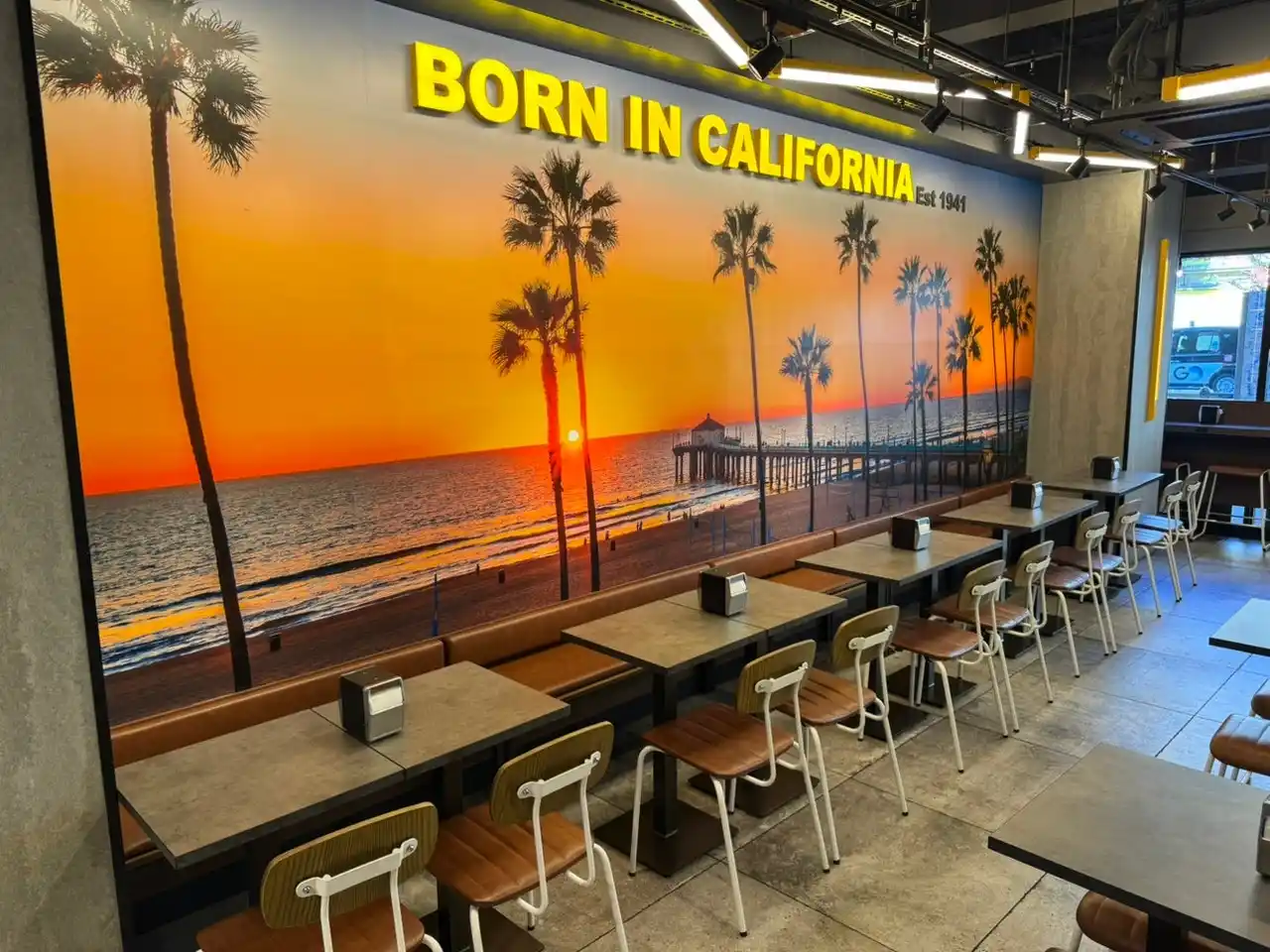 カールスジュニア最新モデルを導入した内装は、まるでカリフォルニアのビーチサイドで食事をしているかのような空間を体験できるものです。サーフボードやヤシの木のビーチサイドがデザインされ、居住性もアップしています。 |
