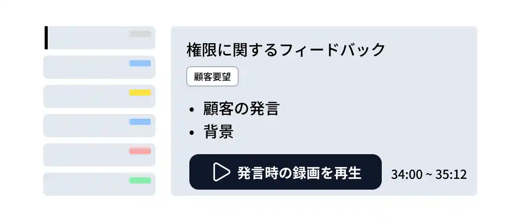 商談内容から自動的にVoCを抽出し、構造化されたDBを構築。1クリックで該当の会話を再生できます。 |