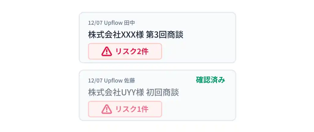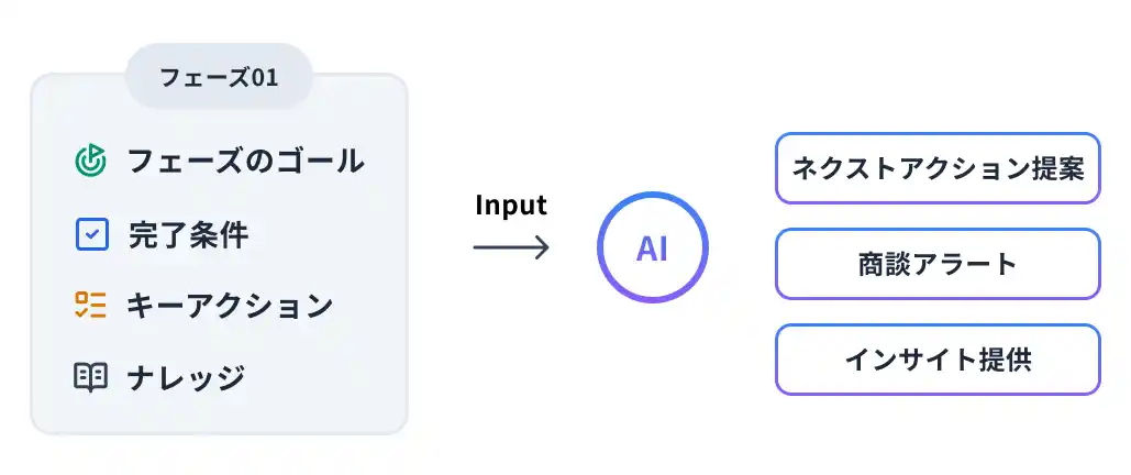 リスクの早期発見と、先手の介入 停滞しているフェーズ、決裁者の不在など、後から致命傷になるリスクをAIが早期に検知。「手遅れ」になる前に具体的な介入が可能になります。 |