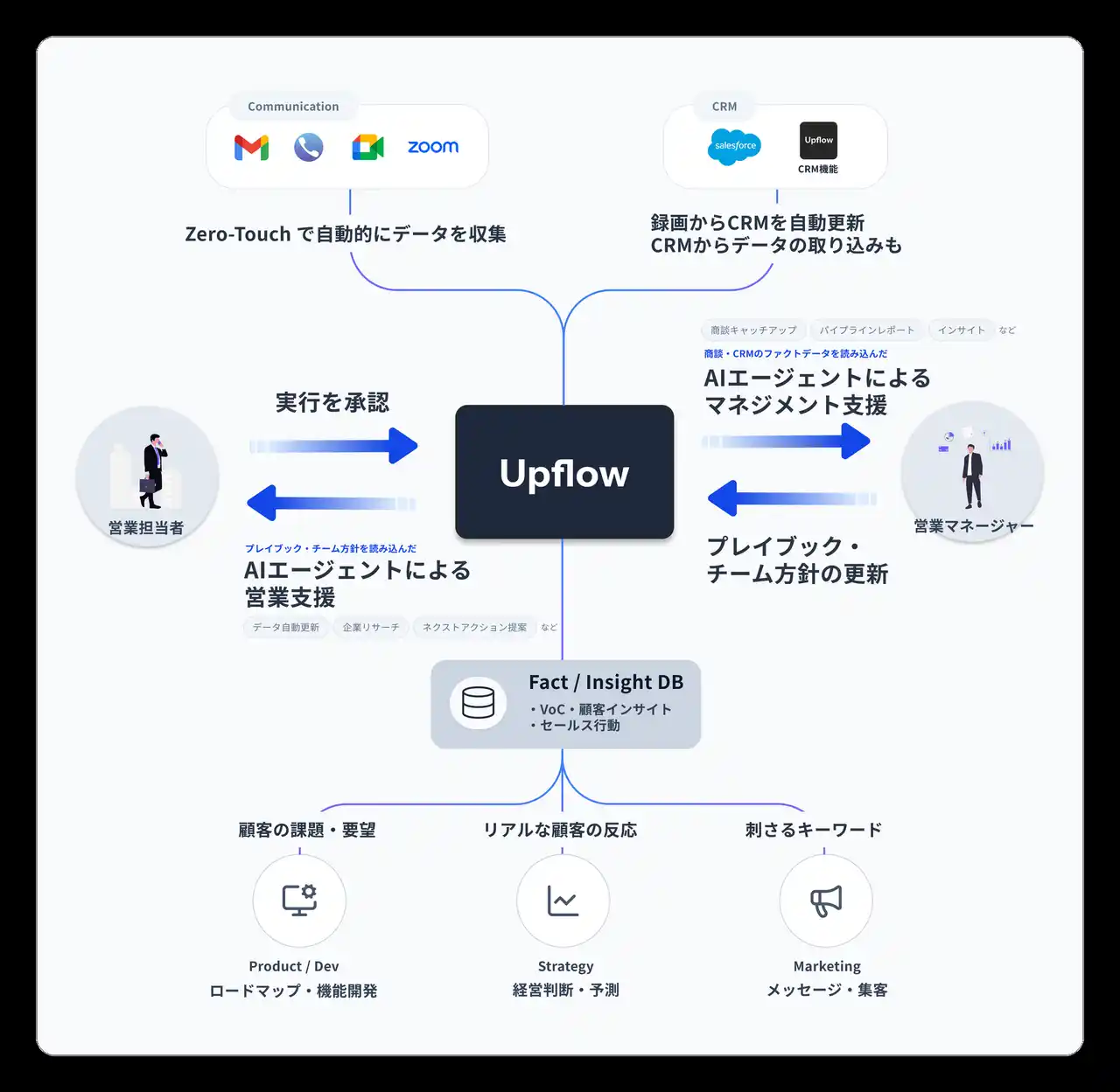 Upflowは、営業だけでなく、CS・マーケティング・開発・経営まで、顧客接点で生まれる「VoC(顧客の声)」を起点に組織全体が高い解像度で仮説検証を回し続ける「学習する組織」への進化を支えます。 |
