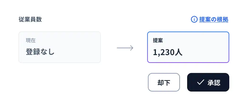 企業リサーチや商談の内容から、CRMのデータ更新を提案します。承認後は自動更新されます。 |
