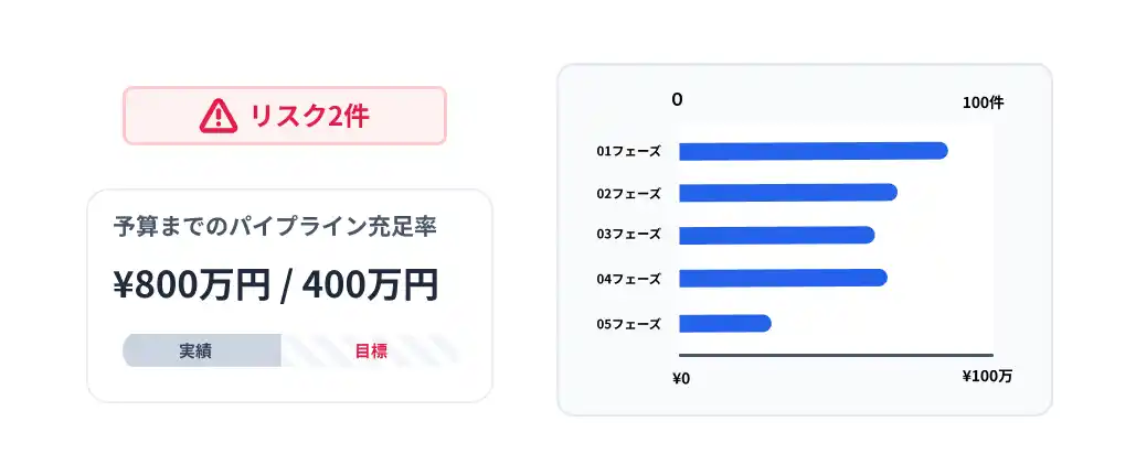 毎日、チームやメンバーごとのパイプライン状況、予算達成状況を可視化し、AIがアラートを表示します。 |