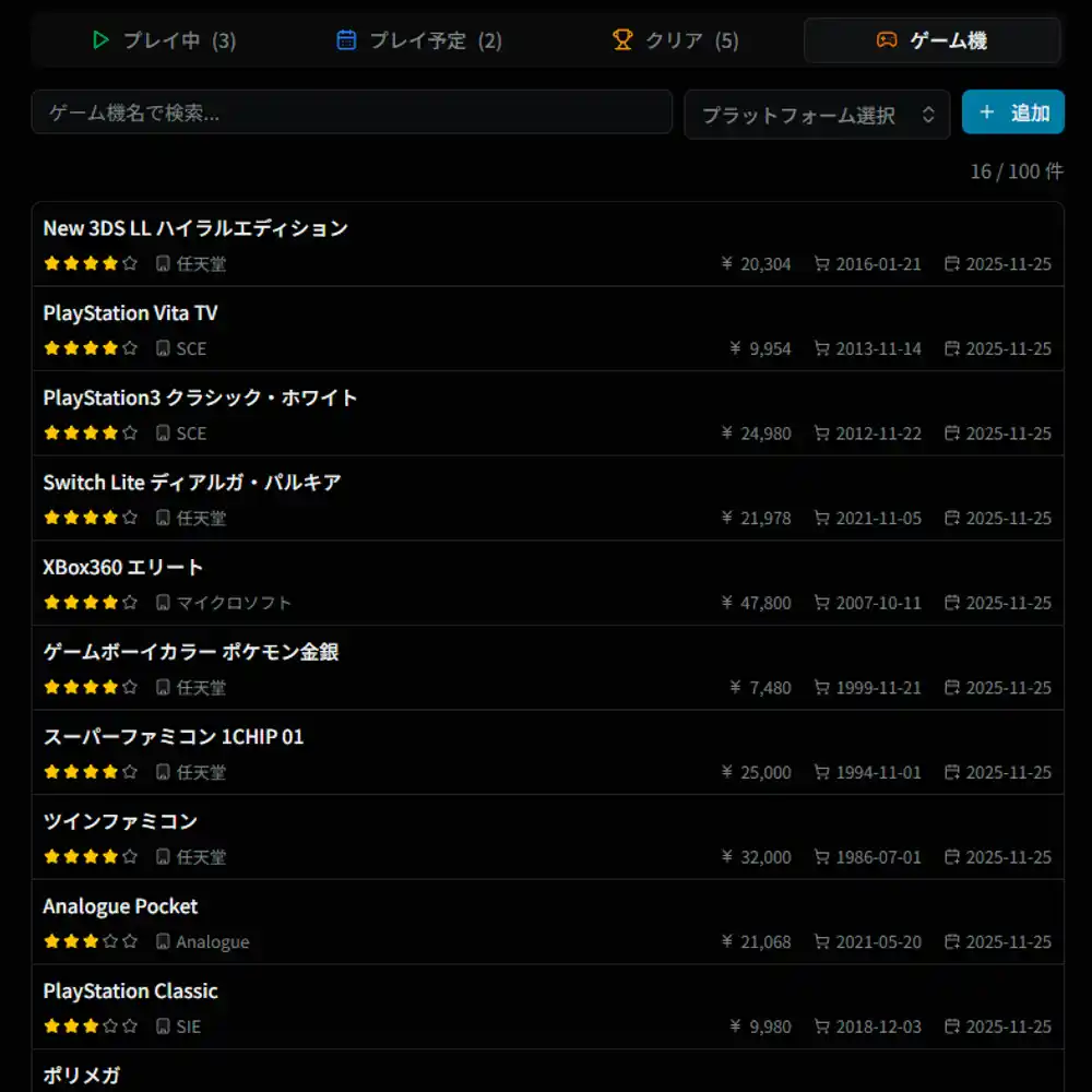レトロゲームファンにとって重要な「プレイ環境」の管理にも対応しました。所有しているゲーム機本体(コンソール)を登録し、プレイ記録と紐づけることが可能です。 |