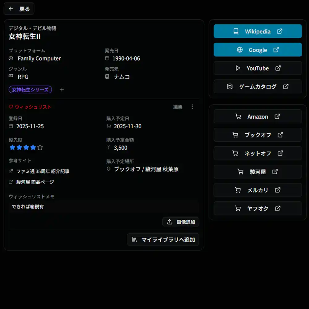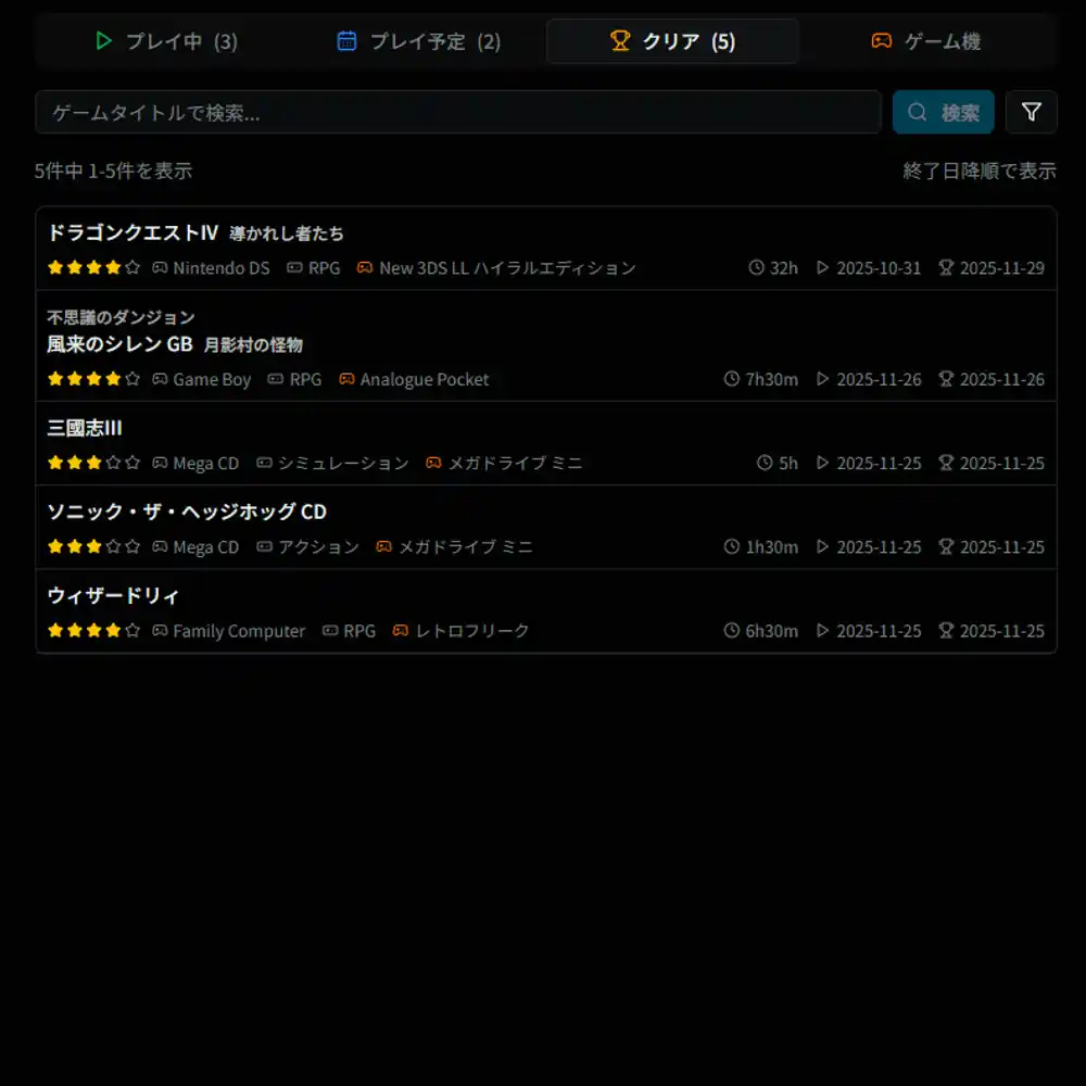 「実機で遊んだか、互換機で遊んだか」といったこだわりの記録を残せます。 また、データベースにない最新プラットフォームゲームやインディーゲームも「カスタムゲーム」として登録可能なため、あらゆるコレクションを網羅できます。 |