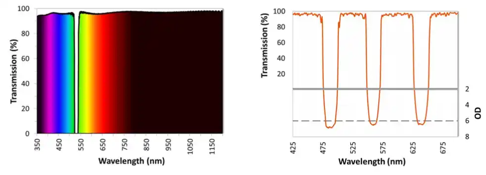右下: 急峻なエッジ、深いブロッキング、および 100% に近い広範囲の透過率を備えたマルチノッチフィルター |
