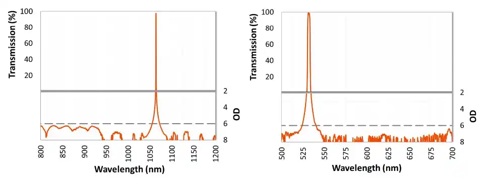 左下: 超狭帯域フィルター(1064 nm Nd:YAG レーザー使用条件、 OD6 ブロッキング |