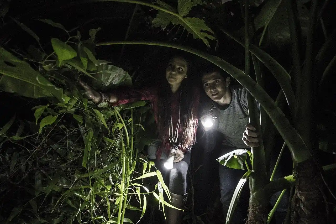 懐中電灯ひとつを頼りに、真っ暗なジャングルを歩くことで、視覚以外の感覚が研ぎ澄まされます。 |