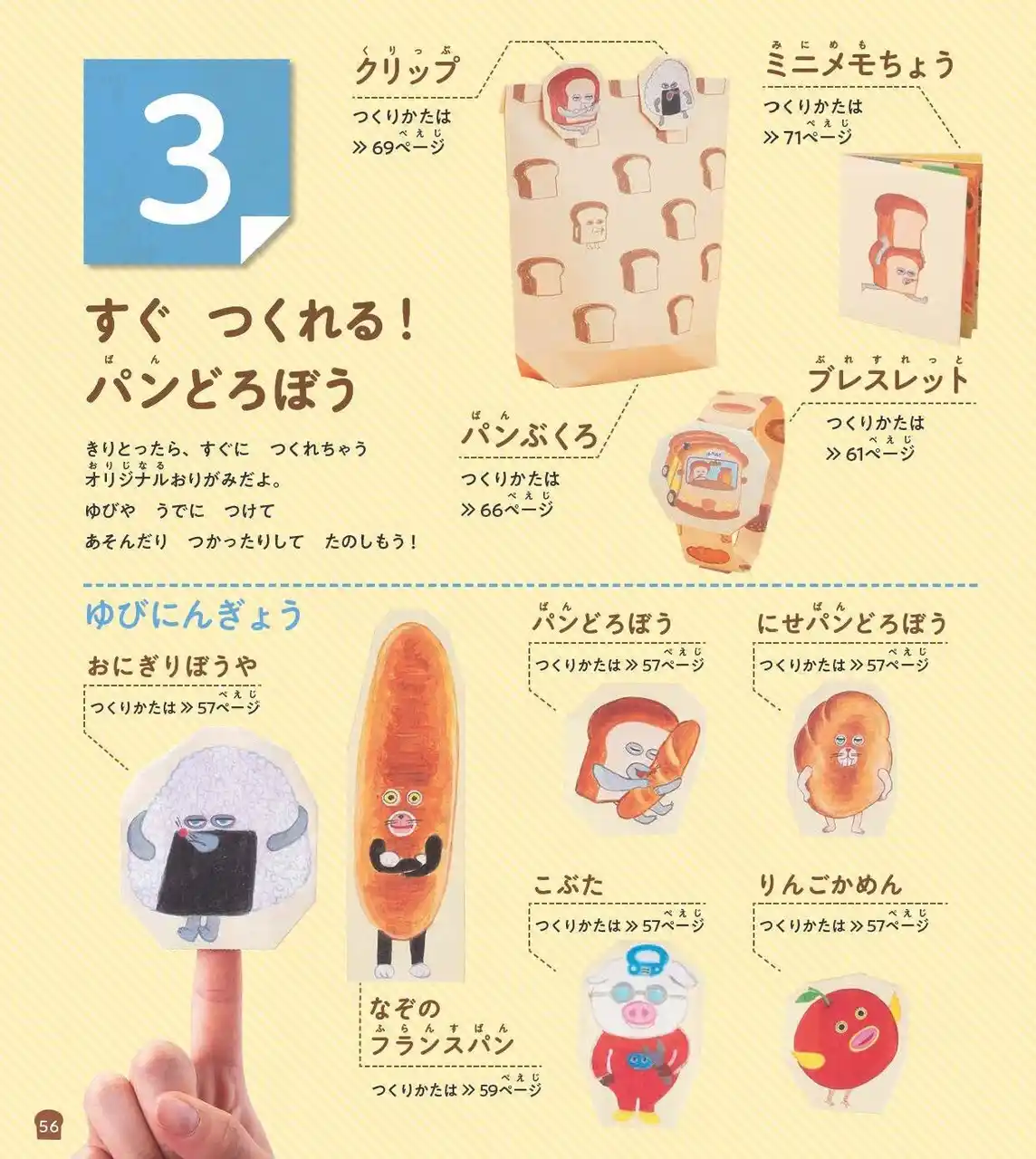 ▲6巻『パンどろぼうとりんごかめん』までに出てきたキャラクターが市販のおりがみで折れます。 |