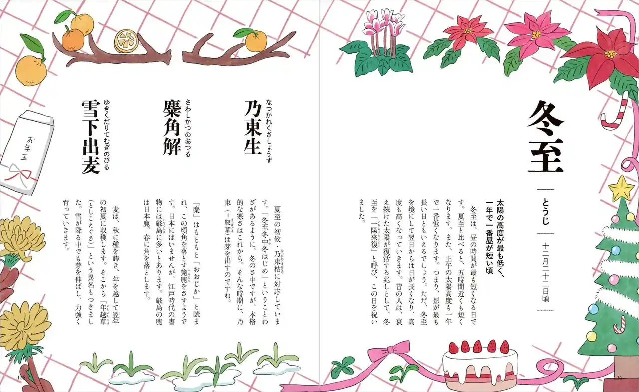 第二章では、二十四節気(にじゅうしせっき)と七十二候(しちじゅうにこう)の言葉を紹介します。二十四節気は1年を約15日に分け、それぞれの時期を漢字2文字で表したもので、七十二候は、「桃始笑(ももはじめてさく)」「雷乃発声(かみなりすなわちこえをはっす)」などのように、3文字や4文字の漢字で表されます。気候という言葉は、この二十四節気の「気」と七十二候の「候」からきています。 |