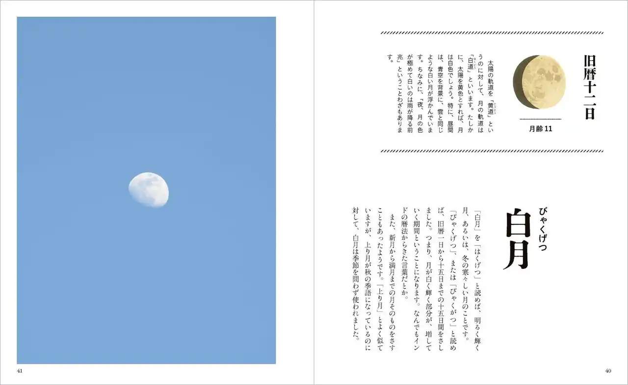 第一章では月の写真を添えながら、「月の剣」「細愛壮子(ささらえおとこ)」「白月(びゃくげつ)」「片割月」「弧月」「黒月」など、ひと月の月の満ち欠けにまつわる言葉を紹介します。 |
