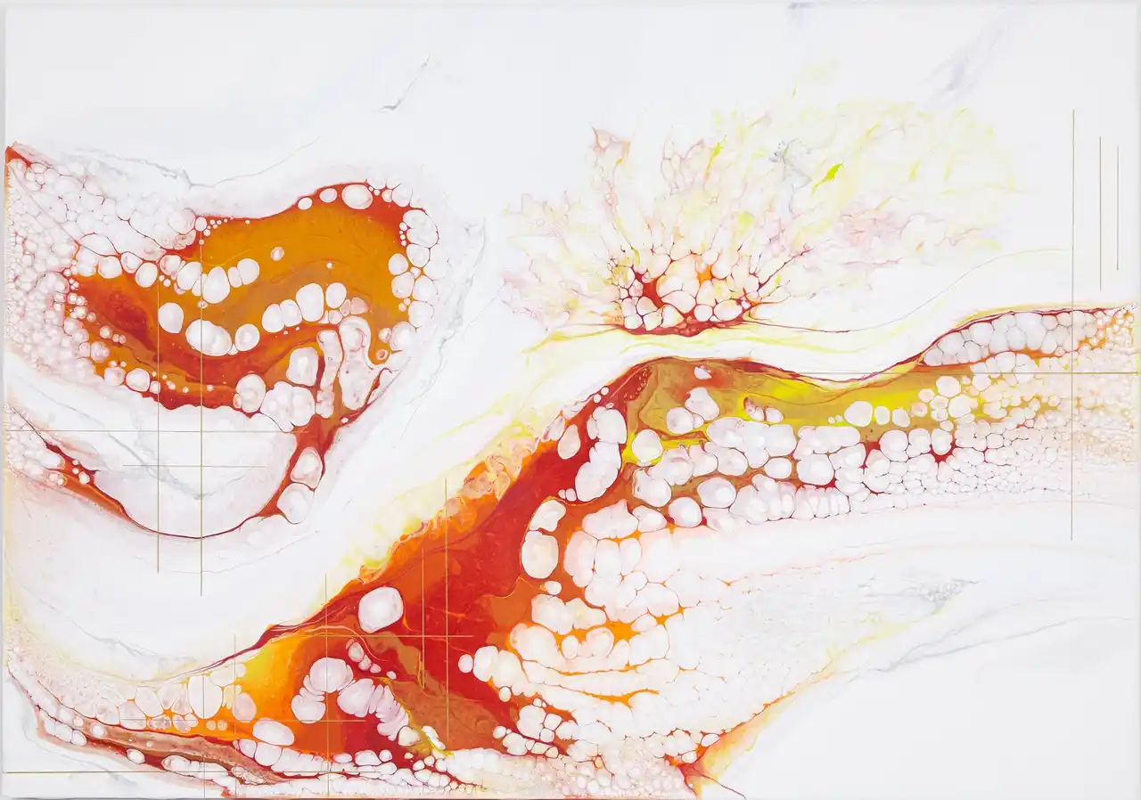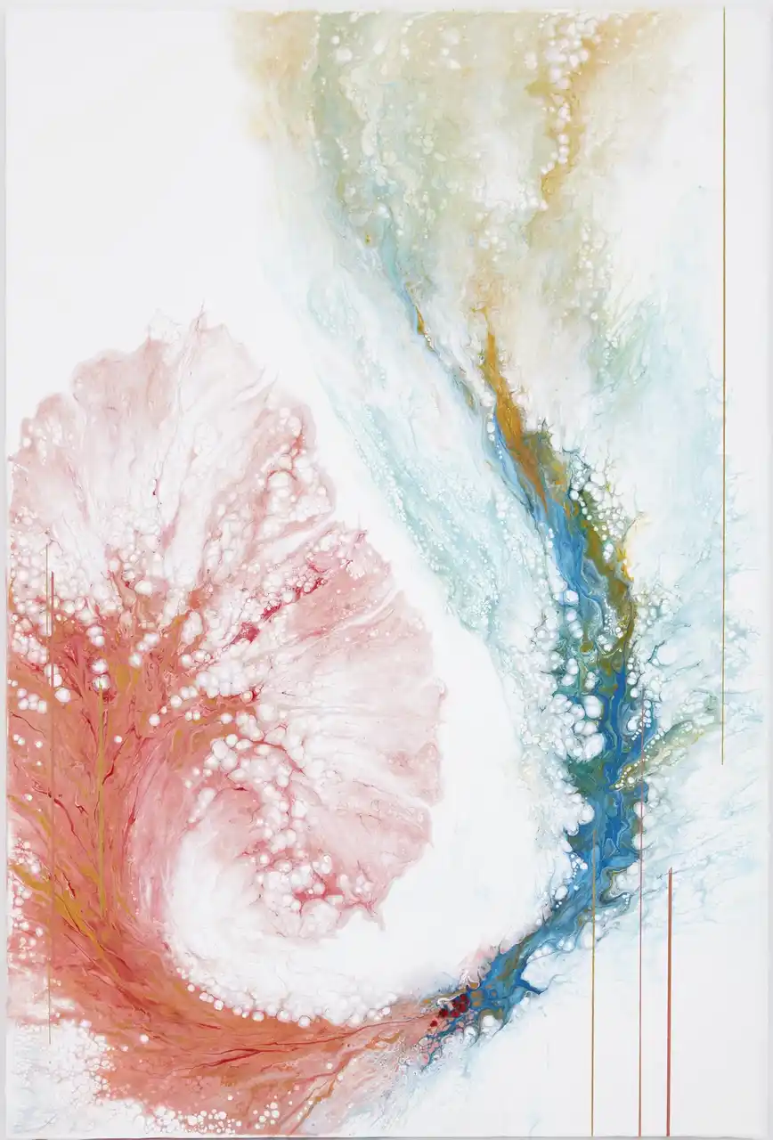 日々の中で奇跡のまばたく瞬間と、限りない不思議な美しさの偶然性を生みだすポーリングアートの世界を、キャンバスの上で表現いたしました。 轟 悠(藏人) |