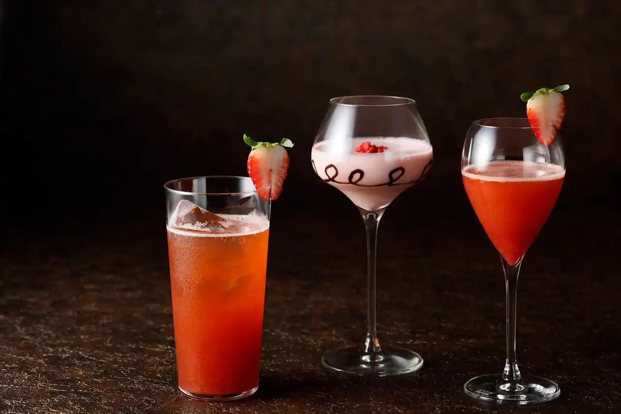 同期間、いちごの王様“あまおう”の魅力をさまざまなスタイルでお楽しみいただけるカクテルが3種類登場いたします。紅茶の香りが心地よく広がる「あまおうダージリンクーラー」は軽やかな味わいが魅力的な一杯です。「あまおうアレキサンダー」は、ミルキーな余韻が続くなめらかな口当たりが冬の夜に調和します。果実の甘みと深みを兼ね備えた「あまおうレオナルド」の華やかな赤は視覚にも印象的です。 |