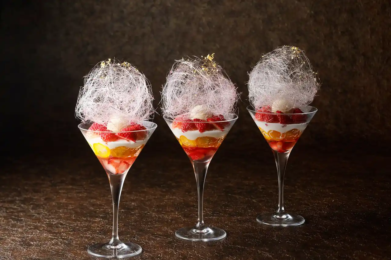 1・2月に登場する『大人のいちごパフェ』は、いちご本来の香りと瑞々しさを閉じ込めたジュレをベースに、フレッシュないちご、優雅な白ワイン風味の金柑のコンポートを重ねた、冬ならではの華やかな一品です。中央にはバニラアイス、仕上げには繊細にきらめく飴細工と金箔を纏わせました。主役であるいちごの可憐さが際立つ、冬にふさわしい上質なパフェです。 |
