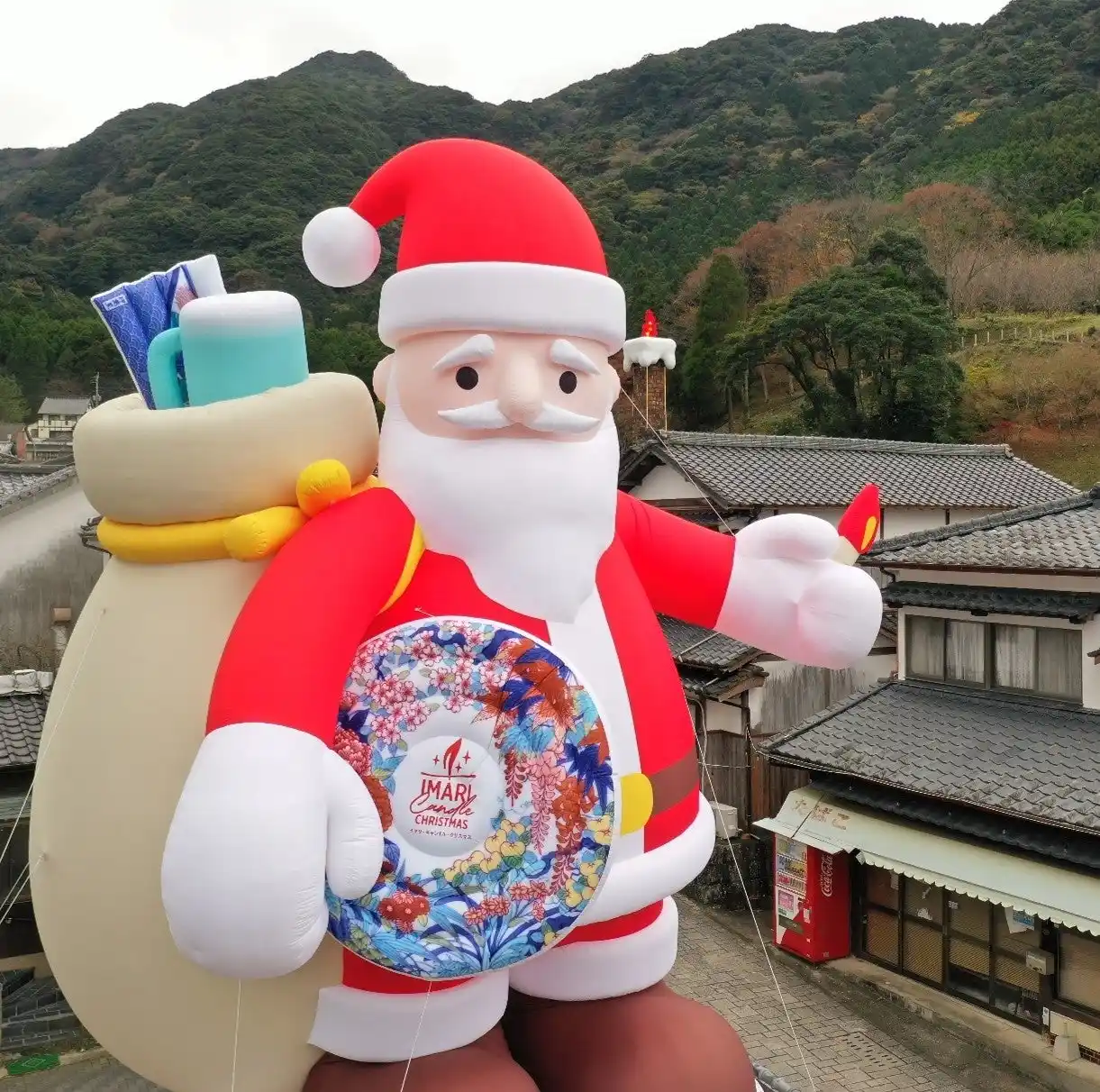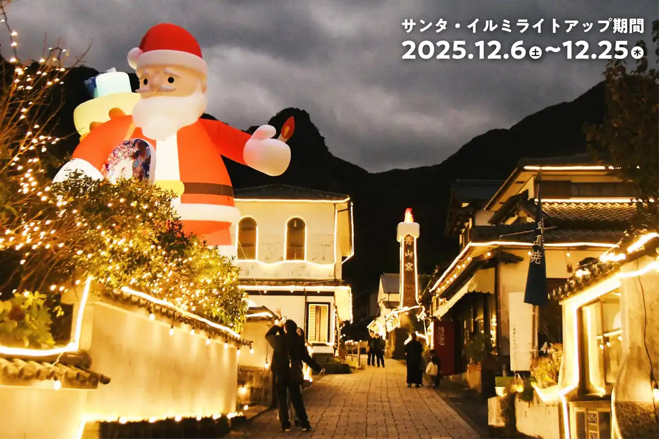12月6日(土)から高さ10mの「巨大サンタクロース」が大川内山に登場し、「巨大えんとつキャンドル」や街並みを彩るイルミネーションと共に冬の街並みを明るく照らしています。 |