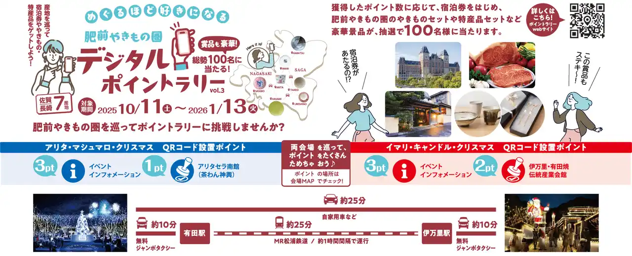 「イマリ・キャンドル・クリスマス」を一層楽しめるデジタルポイントラリーを開催します!会場でQRコードを読み取って、デジタルポイントを獲得。集めたポイントで宿泊券や特産品セットなど、豪華賞品の抽選に応募可能!さらに、同日開催の「アリタ・マシュマロ・クリスマス」とともに、両イベント会場では、開催中に獲得できるポイント数がアップ!イベント会場で是非チェックしてみてください。そのほか、肥前やきもの圏である佐賀県・長崎県の7つのやきものの産地に設置された42スポットでポイントが獲得できます! |