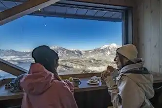 また、雄大な山々や野尻湖を一望する「野尻湖テラス」も同時に営業を開始します。テラスへは観光リフト(第 5 リフト)でアクセスでき、暖かく快適な屋内で雄大な景色を眺めながら、クラフトビールやドーナツなどをお召し上がりいただけます。スキーやスノーボードの合間はもちろん、ウィンタースポーツをされない方も気軽にリフトに乗ってお楽しみいただけます。 |