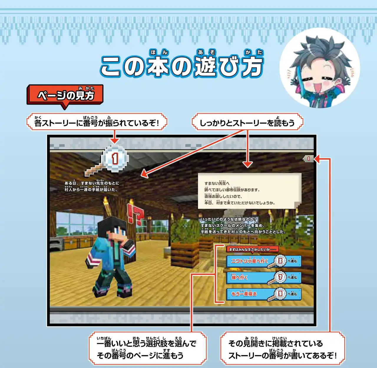 ゲームブックとは次のページが決まっておらず、自分の選択次第で話がどんどん変化していく仕様となっている書籍で、実際に冒険をしているような感覚でお楽しみいただけます。 |