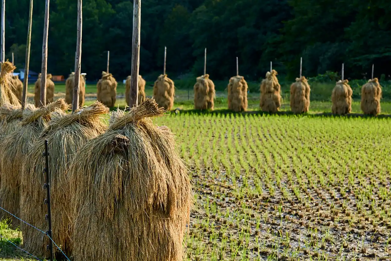 | 「ゆきむすび」の収穫では、コンバインの使用とあわせ、鳴子ならではの農村風景を守り残すため、バインダーで稲を刈り取り、手で杭に掛ける「杭掛け」での乾燥も行ないました。手作業となり、労力が必要となるため、米プロに参加する「杭掛け応援隊」に協力してもらいながら今も続けています。 | |||||||||||||||