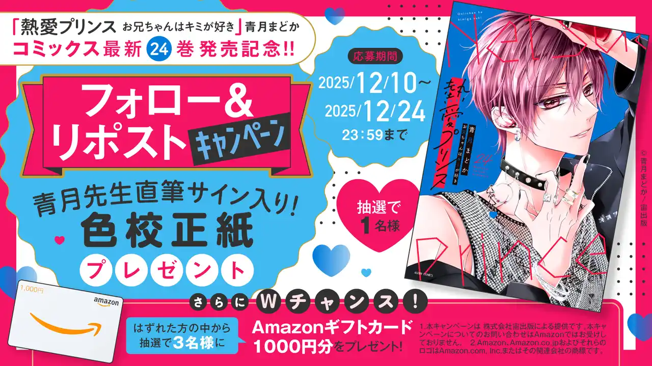 『熱愛プリンス お兄ちゃんはキミが好き』24巻の発売を記念してフォロー&リポストキャンペーン開催。 |