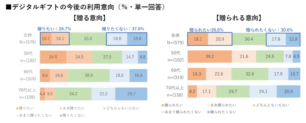 デジタルギフトは「気軽に贈れる・もらえる」が利点とされつつ 「不慣れなので不安」「心がこもっていない」などの声も。 今後の利用意向は、意見が分かれた。