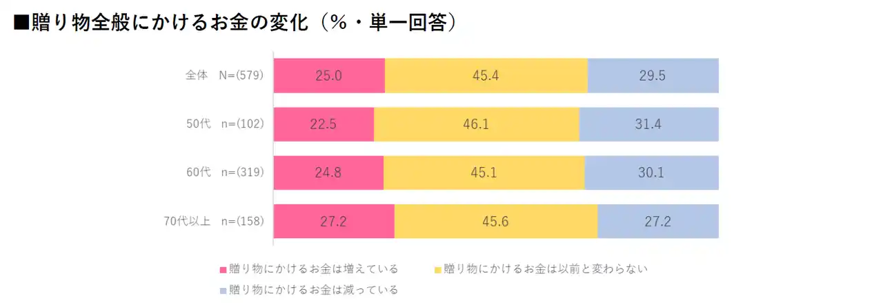 「3年前と比較したときの贈り物全般にかけるお金」は、全体では「以前と変わらない」45.4%と最も多く、「増えている」25.0%、「減っている」29.5%は同程度。 |