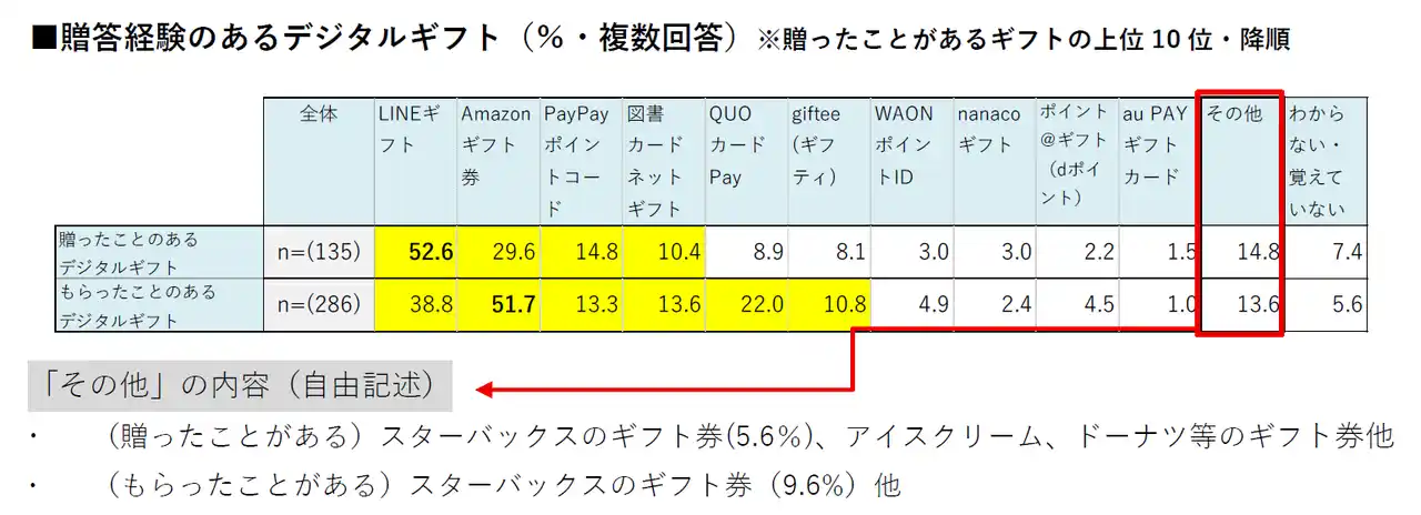 「その他」の自由記述をみると、贈答経験のあるデジタルギフトは「スターバックスのギフト券」が多かった。※単独項目として集計した場合には上位10位に入る。 |
