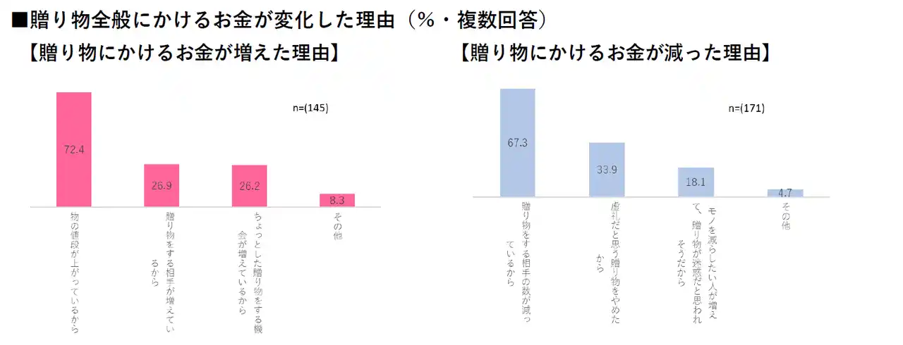 増えた理由で最も多いのは「物の値段が上がっているから」。減った理由で最も多いのは「贈り物をする相手の数が減っているから」だった。 |